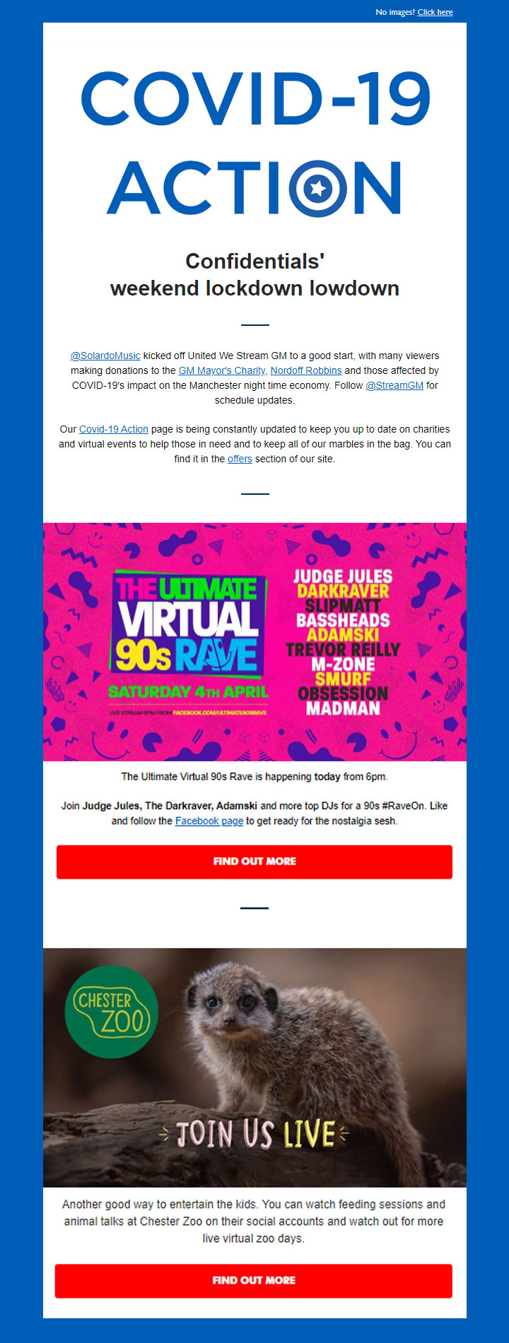 During the Covid-19 pandemic I created branding and content for a weekly newsletter which promoted online activities to keep people entertained during lockdown and to help raise money and brand awareness for local charities.