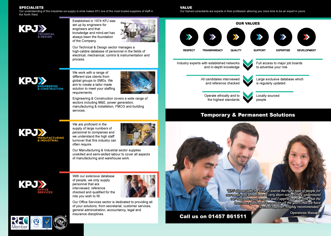 This is an A4 printed brochure I designed for KPJ Group. They are a recruitment company who specialise in engineering and industrial recruitment. I incorporated their existing logo and business sector headings.